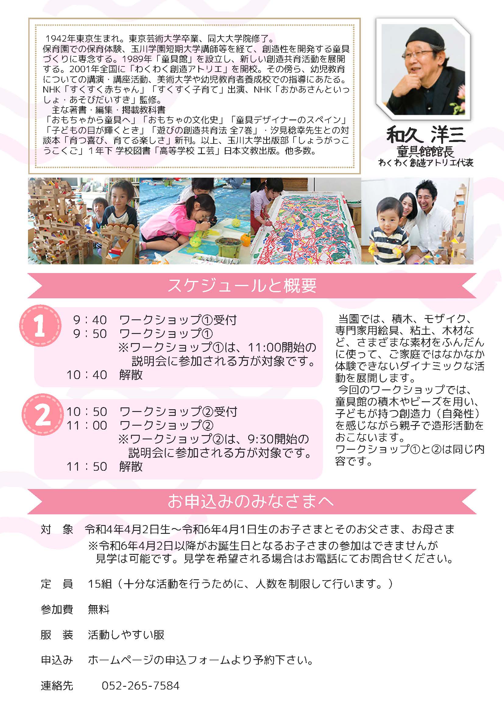 | 備 考 | ・入園説明会参加者を対象に園庭を開放します。 いろんな遊具で遊んだり砂場遊びをしたりして過ごせます。 開放時間は9:00~12:00、雨天時は中止となります。 ・台風等の気象の状況により、開催できない場合は、ホームページにてお知らせいたします。 ・入園説明会と同時に、『わくわくワークショップ』を実施予定です。 申し込みフォームを用意しておりますのでご参照下さい。 ![]() ![]() |
